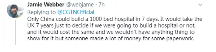 “只有中國才能在7天內修建一個容納1000張床位的醫(yī)院了!這在英國,花上7年的時間也就只夠決定到底能不能建造一個醫(yī)院.......”