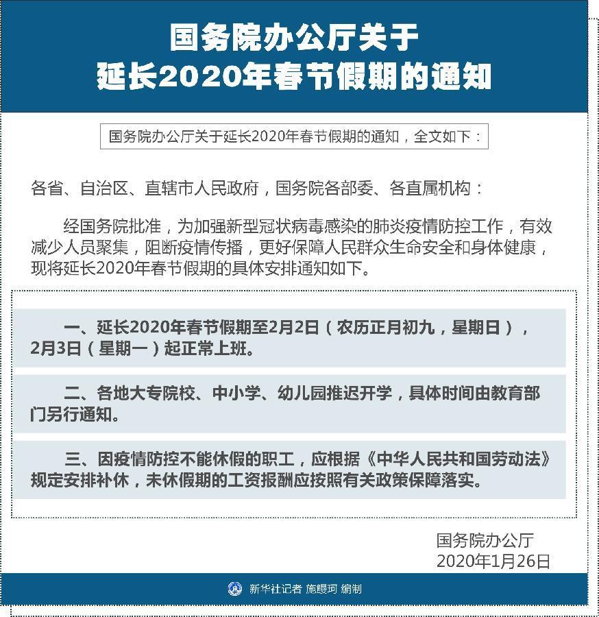 經(jīng)國務(wù)院批準,為加強新型冠狀病毒感染的肺炎疫情防控工作,有效減少人員聚集,阻斷疫情傳播,更好保障人民群眾生命安全和身體健康,現(xiàn)將延長2020年春節(jié)假期的具體安排通知如下。