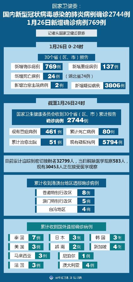 截至1月26日24時,國家衛(wèi)生健康委員會收到30個省(區(qū)、市)累計報告確診病例2744例,現(xiàn)有重癥病例461例,累計死亡病例80例,累計治愈出院51例?,F(xiàn)有疑似病例5794例。