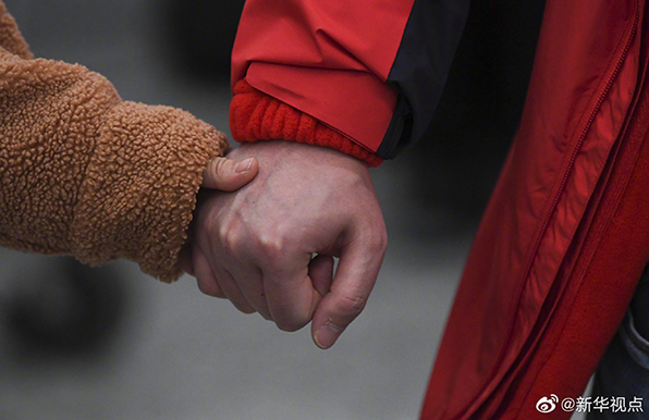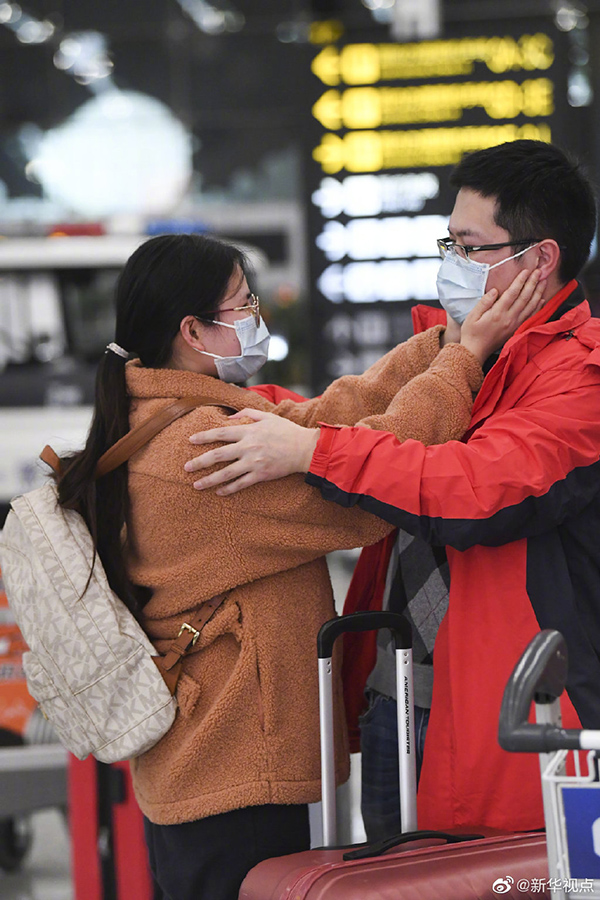 1月26日,重慶市醫(yī)療隊隊員、重慶醫(yī)科大學(xué)附屬第一醫(yī)院呼吸內(nèi)科主治醫(yī)師蔣磊同未婚妻高佳在重慶江北國際機場道別。兩人原定于2月2日領(lǐng)結(jié)婚證,但現(xiàn)在只能推遲了?!半m然我很擔(dān)心他,也很舍不得他,但我還是鼓勵他去好好工作”,高佳說,“我們現(xiàn)在計劃改在5月20日再去領(lǐng)證,我希望他加油,我等我的英雄勝利歸來”。他們的短暫離別,將換來更多人早日團(tuán)聚。26日晚,130余名醫(yī)務(wù)工作者組成的重慶市醫(yī)療隊從重慶出發(fā),前往湖北省孝感市支援。(記者 王全超)