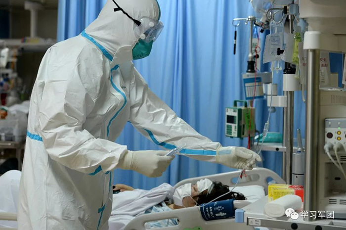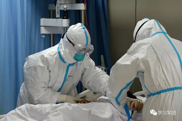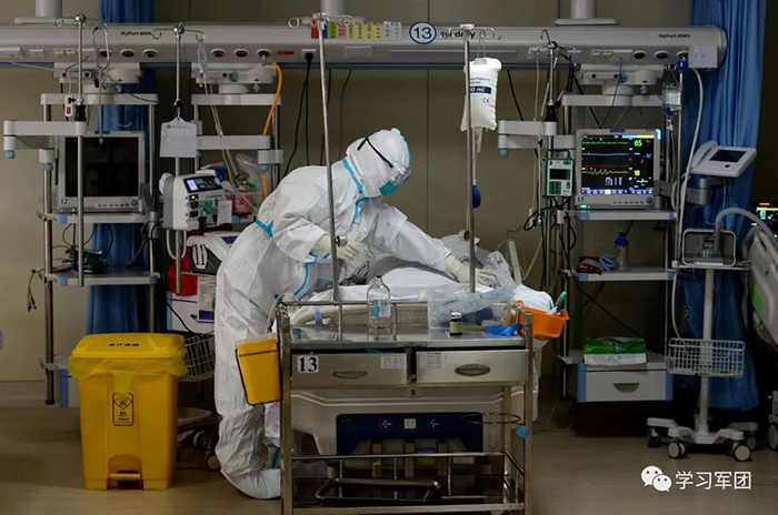 1月27日上午,海軍軍醫(yī)大學醫(yī)療隊醫(yī)護人員在漢口醫(yī)院重癥監(jiān)護室對新型冠狀病毒感染的肺炎患者進行救治。醫(yī)護人員精心護理患者。解放軍報記者范顯海攝