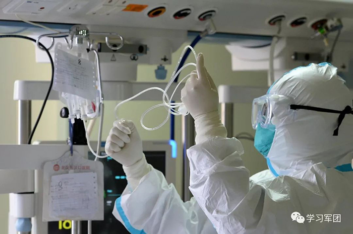 1月27日上午,海軍軍醫(yī)大學醫(yī)療隊醫(yī)護人員在漢口醫(yī)院重癥監(jiān)護室對新型冠狀病毒感染的肺炎患者進行救治。醫(yī)護人員檢查患者輸液管路。解放軍報記者范顯海攝