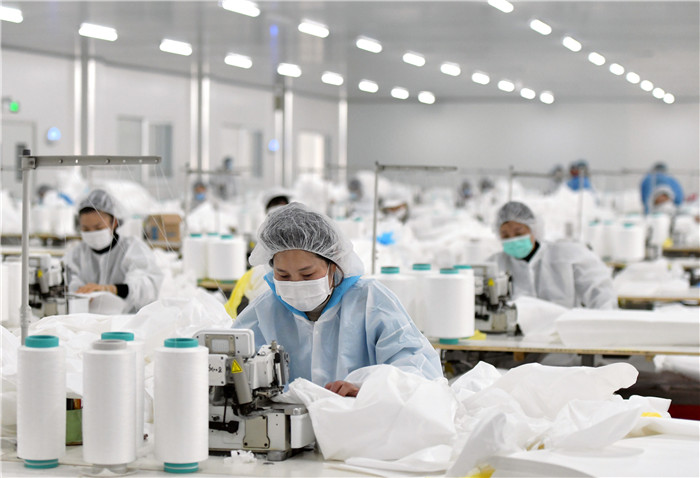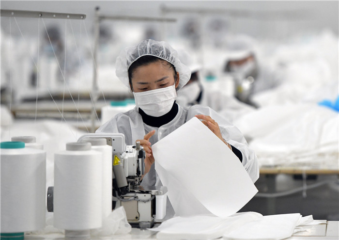 1月28日,在武漢市新洲區(qū)武漢協(xié)卓衛(wèi)生用品有限公司,工人在趕制防護服,該公司是生產(chǎn)手術(shù)服、防護服等產(chǎn)品的企業(yè)。 新華社記者 才揚 攝