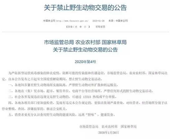 1月28日,國家林業(yè)和草原局印發(fā)《關(guān)于加強(qiáng)野生動(dòng)物管控措施貫徹落實(shí)情況督導(dǎo)檢查工作方案》,要求各地監(jiān)督機(jī)構(gòu)對野生動(dòng)物交易市場、餐館飯店等場所落實(shí)巡查責(zé)任情況,對野生動(dòng)物交易清理情況、野生動(dòng)物疫源疫病監(jiān)測情況進(jìn)行督導(dǎo)檢查,并形成日報(bào)制度。