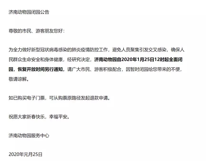 吉林、山東、湖北等地宣布叫停與野生動(dòng)物相關(guān)一切交易和展演活動(dòng)。陜西省林業(yè)局出臺(tái)十項(xiàng)措施,確保人與動(dòng)物的安全距離。1月22日起,武漢市動(dòng)物園、九峰森林動(dòng)物園等景區(qū)都已經(jīng)暫停對外開放。原本計(jì)劃春節(jié)不打烊的濟(jì)南野生動(dòng)物世界,從1月25日12時(shí)起就宣布閉園。飼養(yǎng)員每天按照既定的消毒制度,對籠舍及舍外活動(dòng)場進(jìn)行消毒。