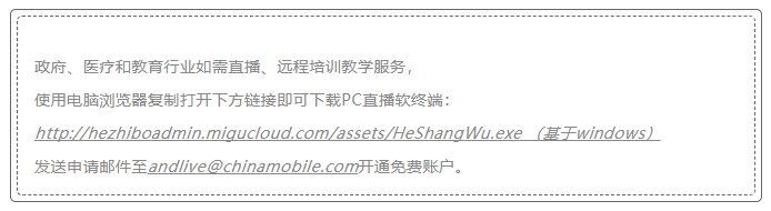 中國移動教育名師直播課堂免費(fèi)提供在線課程學(xué)習(xí)和遠(yuǎn)程直播教學(xué)平臺,掃碼可領(lǐng)取可免費(fèi)課程資源,使用直播能力可撥打4001100868。中國移動企業(yè)和商務(wù)直播為政府、醫(yī)療和教育行業(yè)提供直播、遠(yuǎn)程培訓(xùn)教學(xué)服務(wù),符合條件的用戶可使用直播普及疫情防控知識,或使用電腦進(jìn)行遠(yuǎn)程培訓(xùn)教學(xué)等。