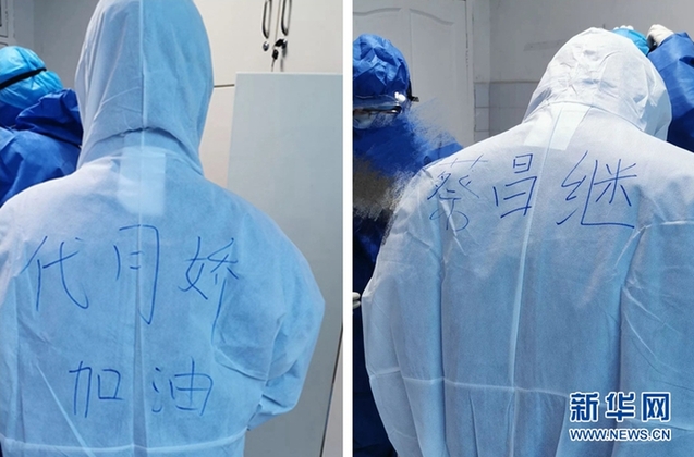 醫(yī)護人員在防護服背后寫上自己的名字。新華網發(fā)(受訪者供圖)