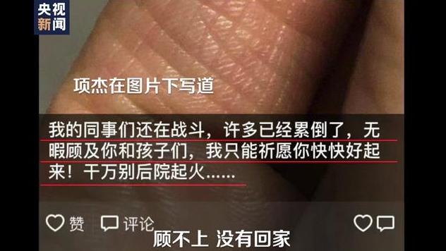 項(xiàng)杰在微信朋友圈寫道:“我的同事們還在戰(zhàn)斗,許多已經(jīng)累倒了,無(wú)暇顧及你和孩子們,我只能祈愿你快快好起來(lái)!千萬(wàn)別后院起火?!?/p>