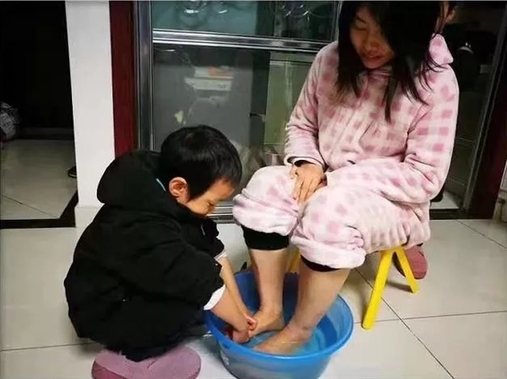 圖為臨行前兒子為媽媽洗腳送行。新華網(wǎng)發(fā)