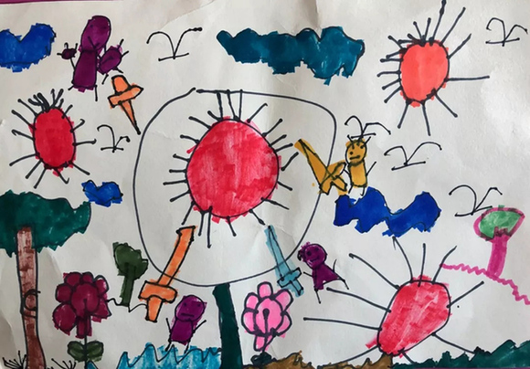 圖為吳丹兒子滴滴畫(huà)的《消滅病毒》。新華網(wǎng)發(fā)