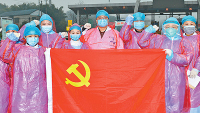 2月5日,在湖南益陽市高速公路鄧石橋出口,參與對乘車人進行體溫監(jiān)測的康雅醫(yī)院黨員重溫入黨誓詞。為發(fā)揮黨員的模范帶頭作用,益陽各交通要道路口、車站卡口工作人員成立了臨時黨支部,設(shè)立了黨員示范崗。宣國祥攝(人民視覺)