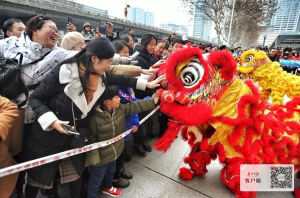 2019年元宵,武漢市民爭(zhēng)相摸“獅子頭”求新年好運(yùn)