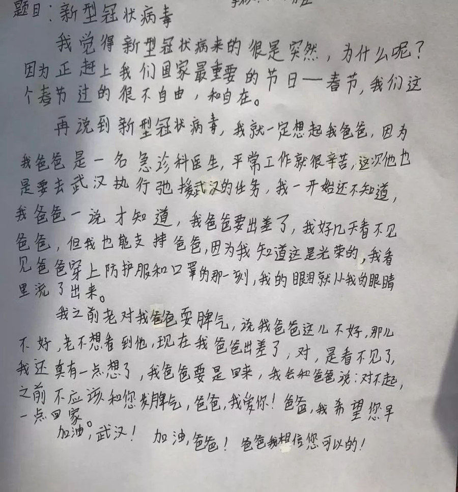 信里他先反思了一下自己,說(shuō)以前盼望著爸爸上班,不希望爸爸在家管他。現(xiàn)在爸爸去前線,我想到危險(xiǎn)性,現(xiàn)在又特別希望爸爸安安全全地回家,然后還說(shuō)了一句,爸爸我愛你!以前從來(lái)沒(méi)有過(guò)。我跟他說(shuō),我希望你在生活和學(xué)習(xí)中面對(duì)困難,無(wú)所畏懼,一直向前,我還說(shuō)爸爸不一定是你的驕傲,但一定要做你的榜樣。