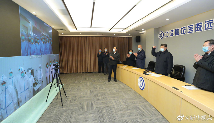 10日下午,習(xí)近平總書記在北京地壇醫(yī)院遠(yuǎn)程診療中心,通過視頻連線武漢市收治新冠肺炎患者的金銀潭醫(yī)院、協(xié)和醫(yī)院、火神山醫(yī)院,稱贊奮戰(zhàn)在疫情防控一線的廣大醫(yī)務(wù)工作者、干部職工和人民解放軍指戰(zhàn)員是“火線上的中流砥柱”。習(xí)近平指出,當(dāng)前疫情防控工作正處在膠著對壘的緊要關(guān)頭,一定要堅持下去,堅決打贏湖北保衛(wèi)戰(zhàn)、武漢保衛(wèi)戰(zhàn)。武漢勝則湖北勝,湖北勝則全國勝。(文字記者張曉松 攝影記者:鞠鵬、謝環(huán)馳)