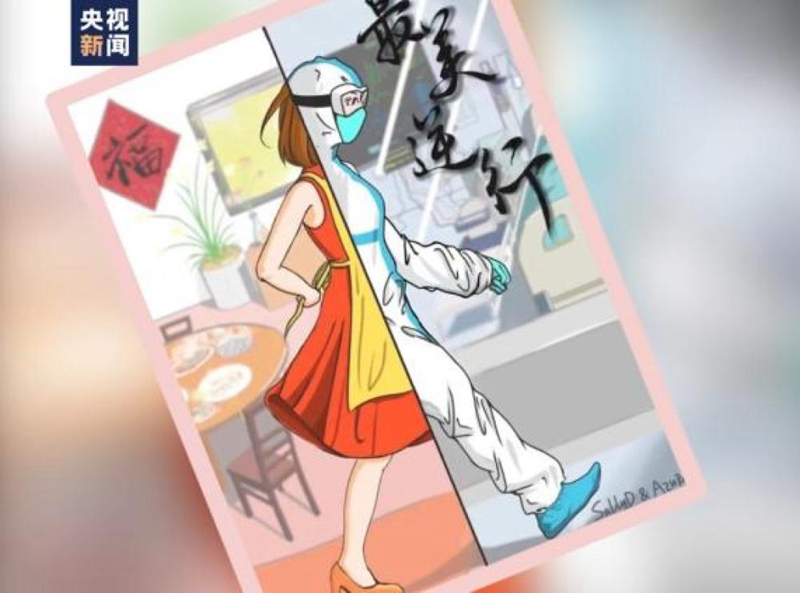 設計師董思喬的母親,是北京大學人民醫(yī)院的一名醫(yī)務工作者。在董思喬七歲那年,正逢非典暴發(fā),她的母親堅守崗位留在醫(yī)院救治患者。十七年后,新冠肺炎來襲,她看到很多醫(yī)務工作者也像當年她的母親一樣在最危險的地方戰(zhàn)斗,義無反顧,馳援武漢。于是,她拿出畫筆畫出她心中醫(yī)務工作者們最美的樣子:“身后,是飄香的飯菜,是溫馨的家;面前,是防疫一線,是需要救治的患者。逆行者們,愿你們平安歸來。”