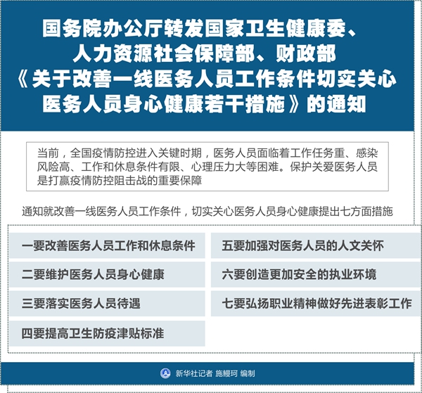 通知就改善一線醫(yī)務(wù)人員工作條件,切實關(guān)心醫(yī)務(wù)人員身心健康提出七方面措施。一要改善醫(yī)務(wù)人員工作和休息條件。加強醫(yī)務(wù)人員職業(yè)暴露的防護(hù)設(shè)施建設(shè)和設(shè)備配置,重點改造醫(yī)生辦公室、值班室和休息室。為醫(yī)務(wù)人員提供良好后勤服務(wù),保障醫(yī)務(wù)人員充足的睡眠和飲食。二要維護(hù)醫(yī)務(wù)人員身心健康。合理安排醫(yī)務(wù)人員作息時間。對于因執(zhí)行疫情防控不能休假的醫(yī)務(wù)人員,在防控任務(wù)結(jié)束后,由所在醫(yī)療衛(wèi)生機(jī)構(gòu)優(yōu)先安排補休。允許需要緊急補充醫(yī)護(hù)人員等疫情防控工作人員的相關(guān)醫(yī)療衛(wèi)生機(jī)構(gòu)簡化招聘程序。加強醫(yī)務(wù)人員個人防護(hù),組織做好一線醫(yī)務(wù)人員健康體檢,最大限度減少院內(nèi)感染。加強心理危機(jī)干預(yù)和心理疏導(dǎo),減輕醫(yī)務(wù)人員心理壓力。三要落實醫(yī)務(wù)人員待遇。為疫情防控一線醫(yī)務(wù)人員和防疫工作者發(fā)放臨時性工作補助。向防控任務(wù)重、風(fēng)險程度高的醫(yī)療衛(wèi)生機(jī)構(gòu)核增不納入基數(shù)的一次性績效工資總量。開通醫(yī)務(wù)人員工傷認(rèn)定綠色通道。四要提高衛(wèi)生防疫津貼標(biāo)準(zhǔn)。出臺提高衛(wèi)生防疫津貼標(biāo)準(zhǔn)的政策。對參與新冠肺炎疫情防疫人員,要及時足額發(fā)放到位。五要加強對醫(yī)務(wù)人員的人文關(guān)懷。動員組織社會力量,對一線醫(yī)務(wù)人員展開慰問。為一線醫(yī)務(wù)人員和家屬建立溝通聯(lián)絡(luò)渠道。對家庭困難的一線醫(yī)務(wù)人員家屬進(jìn)行對口幫扶。六要創(chuàng)造更加安全的執(zhí)業(yè)環(huán)境。嚴(yán)格落實各項安全防范措施,加大警力投入,完善問責(zé)機(jī)制,對發(fā)現(xiàn)有歧視孤立一線醫(yī)務(wù)人員及其家屬行為的,要及時進(jìn)行批評教育,情節(jié)嚴(yán)重的依法予以處理。對傷害醫(yī)務(wù)人員的,要堅決依法嚴(yán)肅查處。七要弘揚職業(yè)精神做好先進(jìn)表彰工作。做好及時獎勵和及時性表彰工作,為做好疫情防控工作增強信心、凝聚力量。