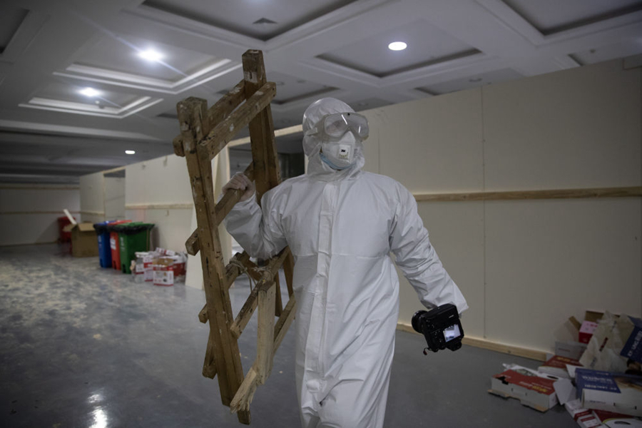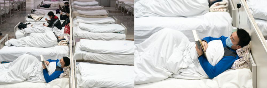 這些身影中還有被隔離的病人。江漢方艙醫(yī)院?jiǎn)⒂玫牡谝惶?,收治的首批病人里,有一個(gè)面目清秀的小伙子。入院躺下后,他打開了一本《政治秩序的起源》,安靜地閱讀??谡终谧×怂谋砬?,但卻藏不住眼神里的平靜和專注??匆娢遗e起相機(jī),他輕輕擺了擺手,示意不用拍他,我猶豫片刻,還是執(zhí)意按下了快門。也許他并不明白,在有些喧囂的方艙醫(yī)院里,近乎靜止的他,是多么的令人震撼。