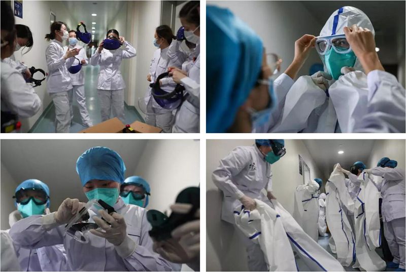 穿防護(hù)服的步驟非常重要,因?yàn)橹挥写┑捻樞蜃鰧?duì)了,脫防護(hù)服時(shí)才不會(huì)接觸到污染源。每一步都攸關(guān)生命,容不得半點(diǎn)差錯(cuò)。一些年輕護(hù)士由于身材過(guò)于瘦小,而防護(hù)服又很大,她們會(huì)用橡皮筋把防護(hù)服仔仔細(xì)細(xì)扎嚴(yán)實(shí)再進(jìn)病房。