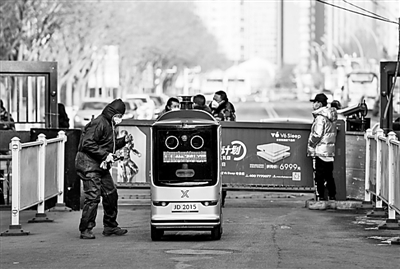 2月7日,京東物流的智能配送機器人進(jìn)入呼和浩特市的一個封閉管理小區(qū),為居民配送快遞。新華社發(fā)