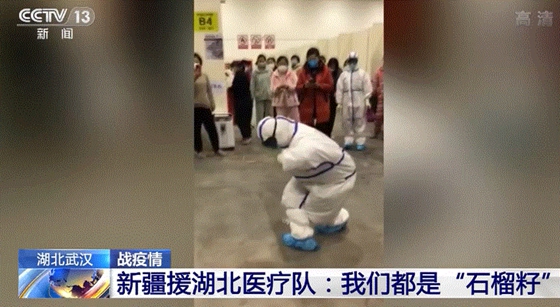 近日,為了沖淡患者們生病的煩惱,新疆第二批支援湖北醫(yī)療隊的巴哈爾古麗·托勒恒,領(lǐng)著大家跳了幾段民族舞。醫(yī)療隊隊長陳暉告訴記者,這支隊伍,一共由五個民族組成——漢族、維吾爾族、哈薩克族、蒙古族、回族。