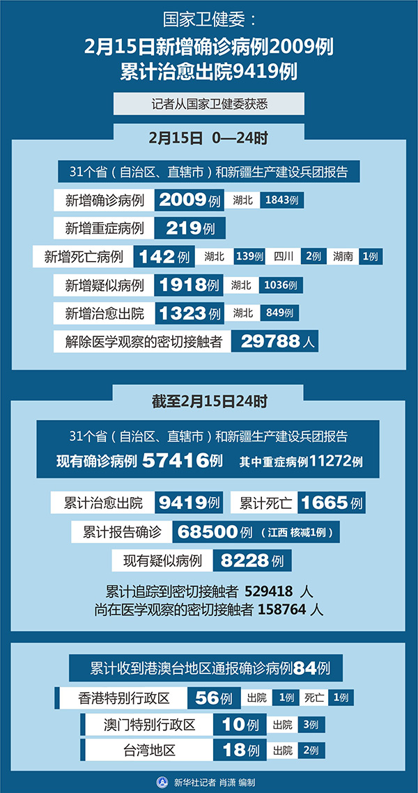 截至2月15日24時(shí),據(jù)31個(gè)?。ㄗ灾螀^(qū)、直轄市)和新疆生產(chǎn)建設(shè)兵團(tuán)報(bào)告,現(xiàn)有確診病例57416例(其中重癥病例11272例),累計(jì)治愈出院病例9419例,累計(jì)死亡病例1665例,累計(jì)報(bào)告確診病例68500例(江西省核減1例),現(xiàn)有疑似病例8228例。累計(jì)追蹤到密切接觸者529418人,尚在醫(yī)學(xué)觀察的密切接觸者158764人。