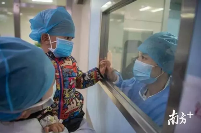 2月3日,在廣東省第二人民醫(yī)院感染科隔離病區(qū),2歲半的源源(化名)與媽媽分隔8天后,終于在隔離病房外與媽媽見面。