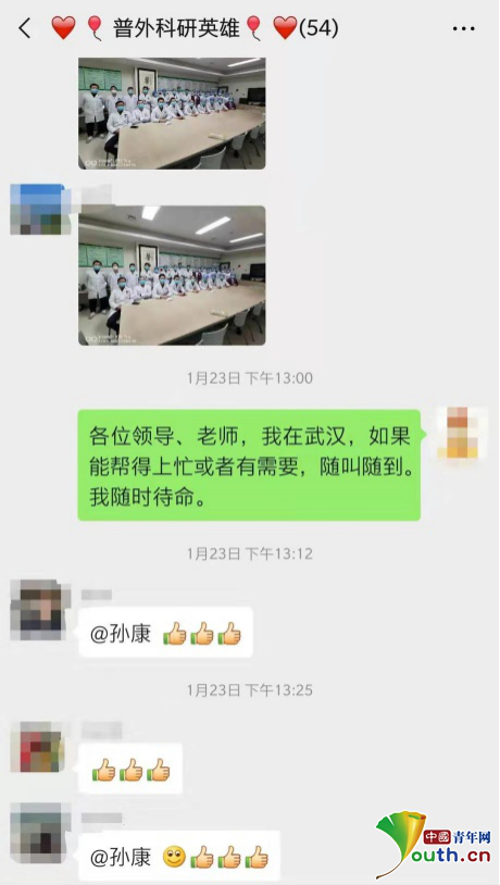 1月23日,看著老師奮戰(zhàn)在抗疫一線,他便主動(dòng)請(qǐng)求上“戰(zhàn)場(chǎng)”。不過(guò),由于他的專業(yè)是外科,因此未被選中。1月24日,孫康在工作群里又得到通知,“醫(yī)院可能抽組醫(yī)療隊(duì)支援地方,進(jìn)行報(bào)名登記”。他便立即二次“請(qǐng)戰(zhàn)”。