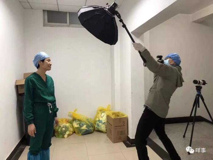 鐘銳鈞說(shuō),在拍攝的兩天內(nèi),他一直守在漢口醫(yī)院的隔離區(qū)外,等到醫(yī)護(hù)人員出門便走上前去,讓每個(gè)人只停留一分鐘,一手舉燈一手持相機(jī)完成拍攝。