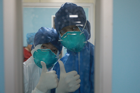軍隊(duì)支援湖北醫(yī)療隊(duì)兩名90后護(hù)士在進(jìn)“紅區(qū)”前為自己加油。陳晨/攝