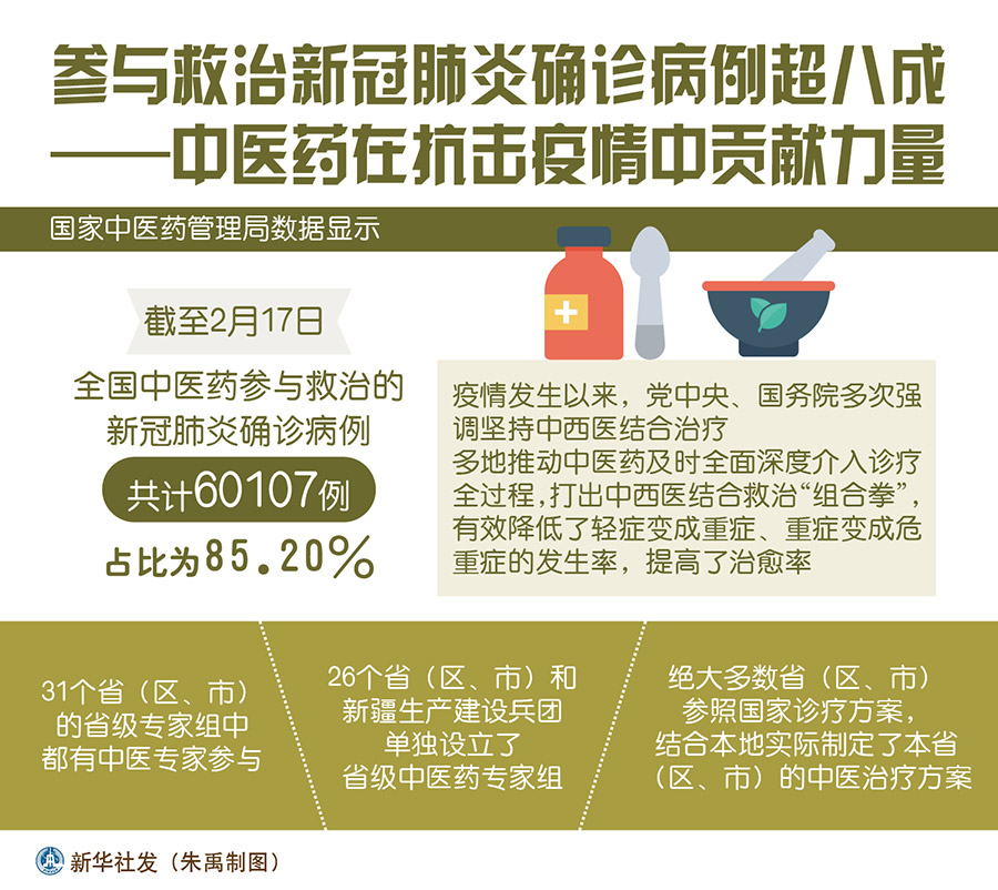 國家中醫(yī)藥管理局數(shù)據(jù)顯示,截至2月17日,全國中醫(yī)藥參與救治的新冠肺炎確診病例共計60107例,占比為85.20%。疫情發(fā)生以來,黨中央、國務院多次強調(diào)堅持中西醫(yī)結(jié)合治療。多地推動中醫(yī)藥及時全面深度介入診療全過程,打出中西醫(yī)結(jié)合救治“組合拳”,有效降低了輕癥變成重癥、重癥變成危重癥的發(fā)生率,提高了治愈率。