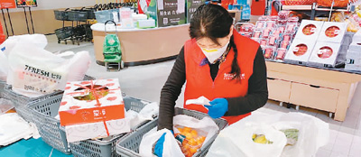 線上果蔬訂單增多,京東七鮮超市的工作人員正加緊分裝物品。圖片來(lái)源:京東