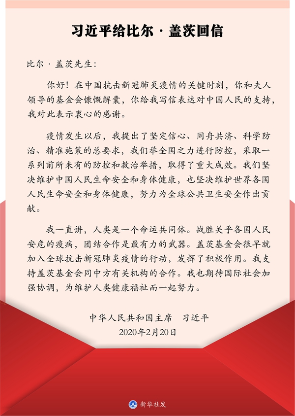 新華社北京2月22日電? 國家主席習(xí)近平2月20日給美國蓋茨基金會聯(lián)席主席比爾·蓋茨回信,感謝他和蓋茨基金會對中國防控新冠肺炎疫情工作的支持,呼吁國際社會加強(qiáng)協(xié)調(diào)、共同抗擊疫情。