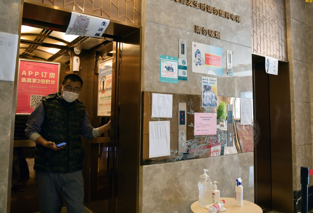 在武漢同濟(jì)醫(yī)院光谷院區(qū),醫(yī)護(hù)人員下班后在乘坐電梯時(shí)所有人都朝向不同方向,期間不說(shuō)話(huà),減少交叉感染風(fēng)險(xiǎn)。