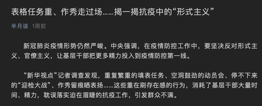 受訪基層干部表示,在基層抗疫中,鄉(xiāng)鎮(zhèn)和部門黨政一把手是“前線指揮”,應(yīng)該時(shí)刻在前線進(jìn)行調(diào)度和決斷,而不是在會(huì)場(chǎng)。中部某市衛(wèi)健委一位負(fù)責(zé)人反映,最近日夜奮戰(zhàn),有時(shí)要忙到夜里兩三點(diǎn)鐘,工作內(nèi)容包括長時(shí)間開會(huì)、寫材料、組織業(yè)務(wù)調(diào)度等。“自己就要倒掉了,希望能在會(huì)議上減減負(fù)。”