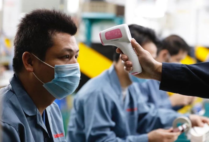 2月10日,廣東格蘭仕集團(tuán)有限公司順德總部車間生產(chǎn)線上的員工測(cè)體溫。新華社記者 黃國保 攝