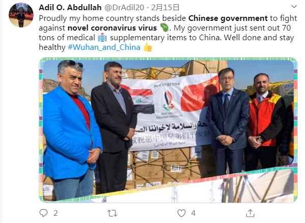 推特用戶(hù)Adil O. Abdullah說(shuō):我的祖國(guó)支持中國(guó)政府抗擊新冠肺炎病毒,我為此感到驕傲。我們的政府向中國(guó)送去了70噸的醫(yī)療補(bǔ)給物資,干得不錯(cuò)。武漢和全中國(guó)都要平安康泰。