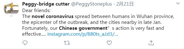 推特用戶(hù)Peggy-bridge cutter說(shuō):親愛(ài)的朋友們,新冠肺炎疫情在武漢和周邊城市暴發(fā)。所幸,中國(guó)政府采取了迅速、有效的行動(dòng)。
