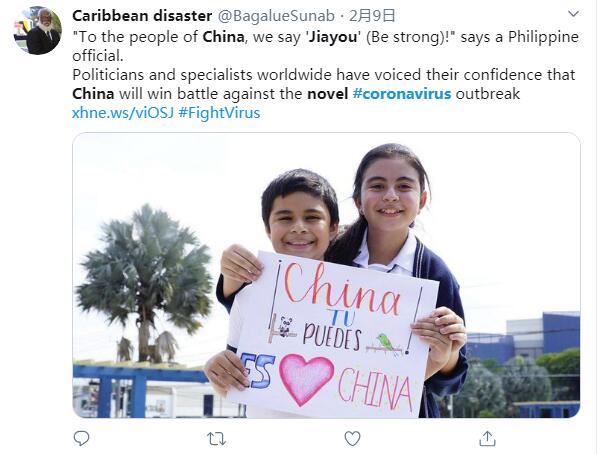 推特用戶(hù)Caribbean disaster說(shuō):一名菲律賓官員表示,想要對(duì)中國(guó)人民說(shuō),你們加油。世界各地的政治家和專(zhuān)家紛紛表示,對(duì)中國(guó)戰(zhàn)勝新冠疫情很有信心。(作者: 嚴(yán)玉潔 資料來(lái)源:新華社、央視網(wǎng)、人民網(wǎng)、國(guó)際在線等)