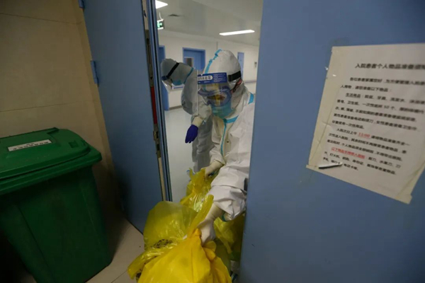 清晨,一名護(hù)士將夜里產(chǎn)生的醫(yī)療廢物送出重癥隔離區(qū)。(攝影:崔萌)
