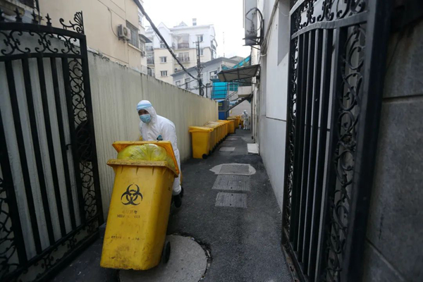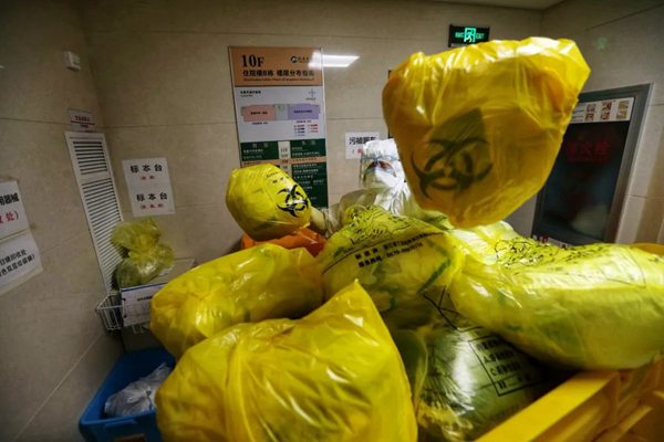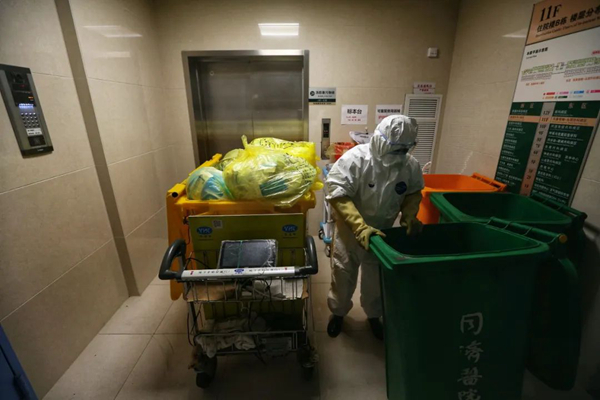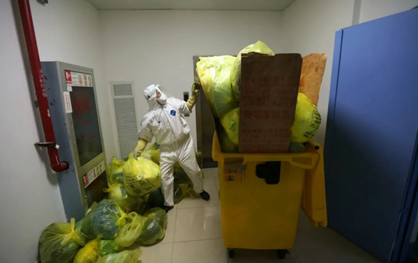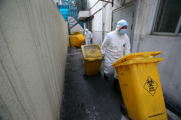 但是醫(yī)療廢棄物產(chǎn)生的速度實在太快,一線醫(yī)務(wù)工作者用完的防護(hù)服、口罩、鞋套……病人的生活垃圾,病人的餐余垃圾,病人的嘔吐物等等感染性廢棄物都要快速處理,醫(yī)療廢棄物產(chǎn)生的速度已超過了后勤部門正常的處理速度。周師傅介紹稱,ICU中的保潔員會將感染性醫(yī)療廢棄物集中放在指定處理間的黃色垃圾桶中,然后他們有四位師傅每天早上六點到下午五點會在整個院區(qū)不停地轉(zhuǎn)運黃色垃圾桶,然后還會安排專人值班,晚上只要接到院內(nèi)科室電話就會趕過去把黃色垃圾桶運出來,他們已經(jīng)保證24小時隨時有人在崗負(fù)責(zé)處理醫(yī)療廢棄物了,“我們不拼命不行啊,這是人命關(guān)天的事。”周師傅稱。