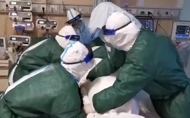 醫(yī)護(hù)協(xié)助應(yīng)用“糖果法翻身”實(shí)施俯臥位通氣。新華網(wǎng)發(fā)