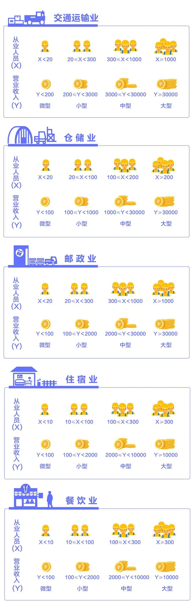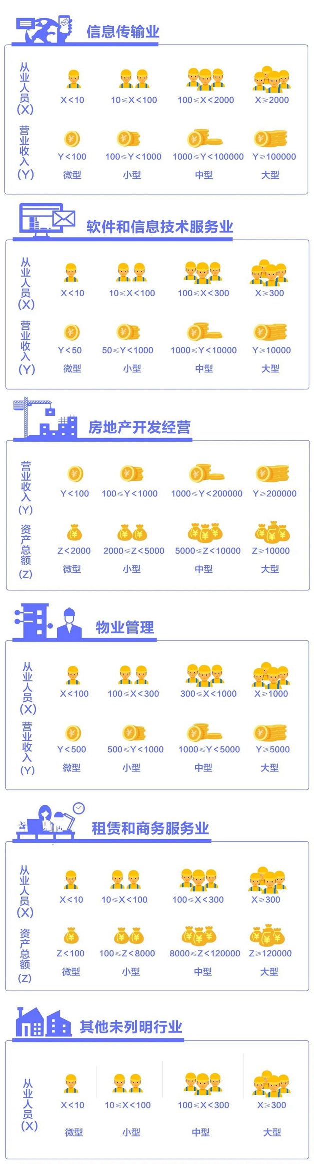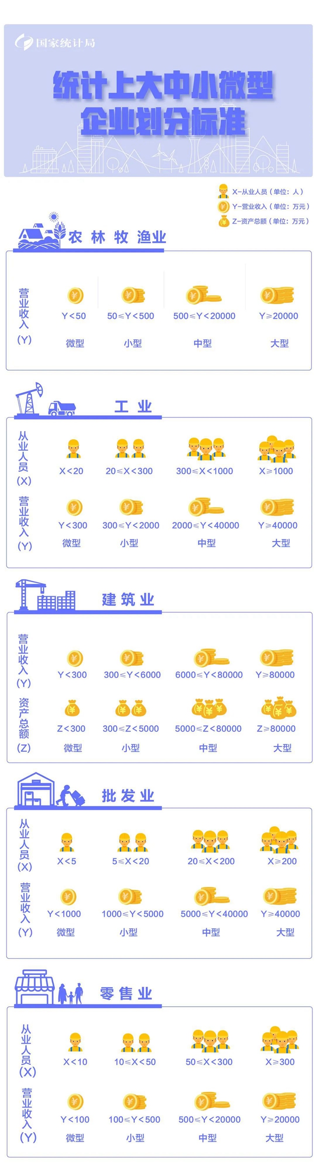 該辦法按照行業(yè)門類、大類、中類和組合類別,依據(jù)從業(yè)人員、營業(yè)收入、資產(chǎn)總額等指標(biāo)或替代指標(biāo),將我國的企業(yè)劃分為大型、中型、小型、微型等四種類型。