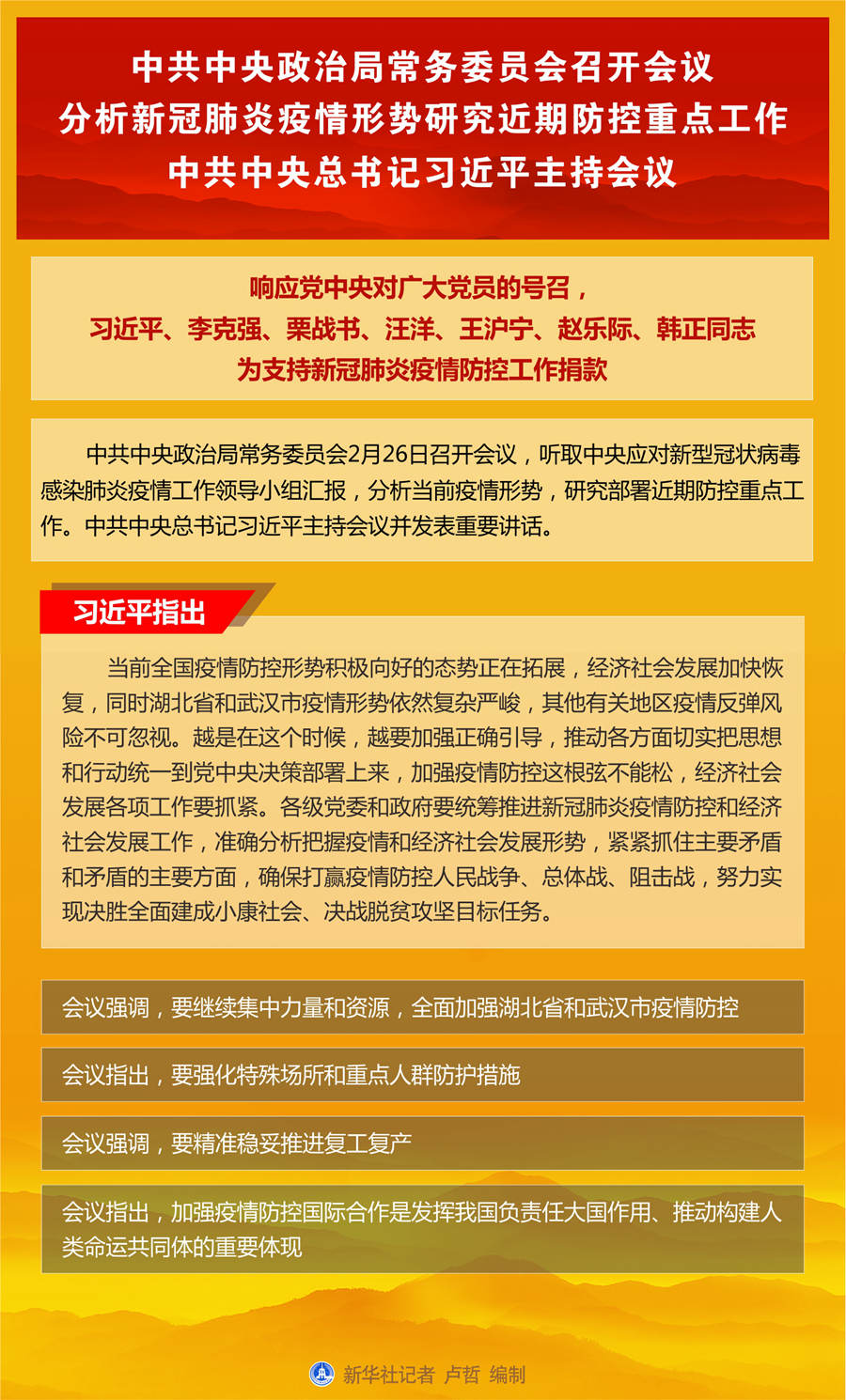 新華社北京2月26日電 中共中央政治局常務(wù)委員會2月26日召開會議,聽取中央應(yīng)對新型冠狀病毒感染肺炎疫情工作領(lǐng)導(dǎo)小組匯報,分析當(dāng)前疫情形勢,研究部署近期防控重點(diǎn)工作。中共中央總書記習(xí)近平主持會議并發(fā)表重要講話。