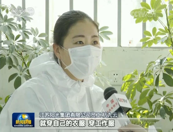 江蘇陽光集團有限公司員工 杭九云:完全不一樣,我們平時干活的話,就穿自己的工作服,穿廠服就好了,現(xiàn)在來了,要穿這個密不透風,我感覺醫(yī)生還要比我們不容易,他們還要去救人,其實他們比我們還要更累,所以堅持吧。