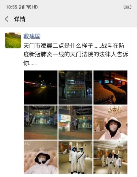 2月5日,天門市委發(fā)出全市干部職工就近參加村(社區(qū))疫情防控工作的號(hào)召后,天門法院黨組認(rèn)真組織,狠抓落實(shí)。戴建國(guó)積極響應(yīng),第一時(shí)間趕到竟陵街道辦事處鴻漸社區(qū)報(bào)到,被安排到新城集中留觀點(diǎn)某酒店值班。