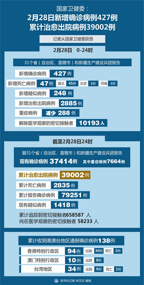 截至2月28日24時(shí),據(jù)31個(gè)省(自治區(qū)、直轄市)和新疆生產(chǎn)建設(shè)兵團(tuán)報(bào)告,現(xiàn)有確診病例37414例(其中重癥病例7664例),累計(jì)治愈出院病例39002例,累計(jì)死亡病例2835例,累計(jì)報(bào)告確診病例79251例,現(xiàn)有疑似病例1418例。累計(jì)追蹤到密切接觸者658587人,尚在醫(yī)學(xué)觀察的密切接觸者58233人。