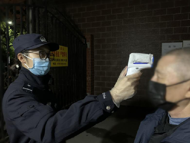 胡馨月在夜晚巡查中為外出的群眾檢測(cè)體溫。(受訪(fǎng)者供圖)