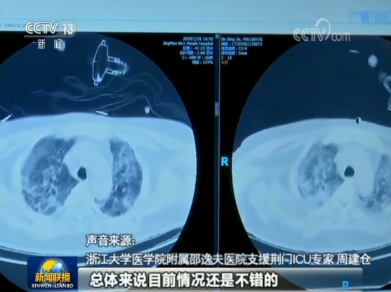 聲音來源:浙江大學(xué)醫(yī)學(xué)院附屬邵逸夫醫(yī)院支援荊門ICU專家 周建倉:左邊是26號(hào)的,右邊是23號(hào)的,肺部吸收還是比較明顯,總體來說目前情況還不錯(cuò)。