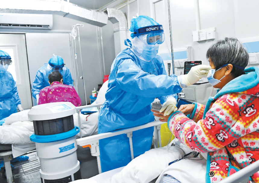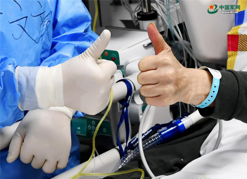 火神山醫(yī)院重癥醫(yī)學一科自2月10日開始收治重癥患者以來,全科醫(yī)護人員不畏風險全力救治,他們根據(jù)患者病情的變化,有預見性地快速調(diào)整救治方案,采取呼吸支持、抗病毒、維護臟器功能、加強營養(yǎng)等方法,使重癥患者逐漸有了好轉(zhuǎn),提高了救治成功率?;ハ喙膭铧c贊,是在重癥室看到最多的場景。解放軍報記者王傳順 攝