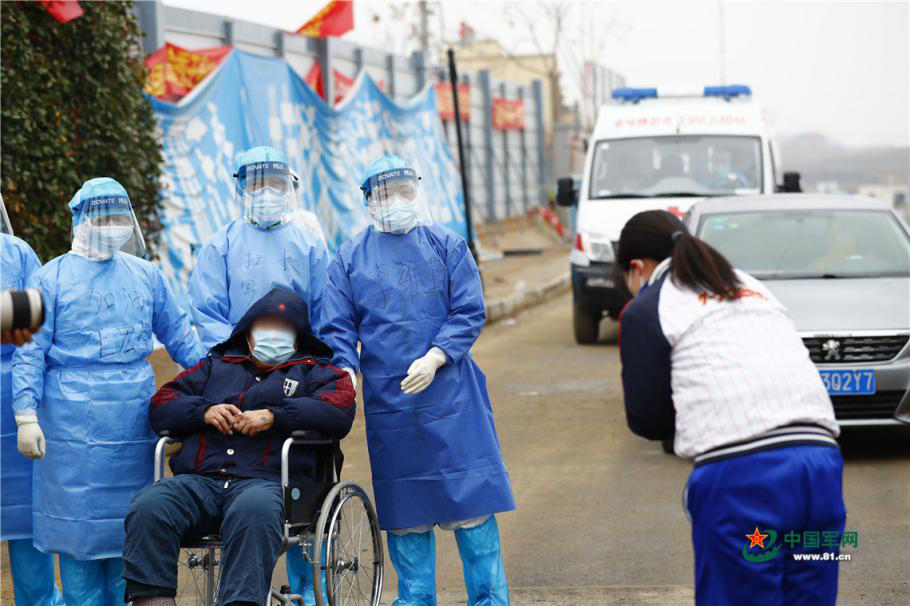 2月27日中午時分,從火神山醫(yī)院傳出好消息,經(jīng)過醫(yī)護人員20多天的科學救治和精心護理,又有76名新冠肺炎確診患者康復走出火神山醫(yī)院,是目前該院單日出院人數(shù)最多的一天。圖為患者家屬向醫(yī)護人員致敬。王皓宇 攝